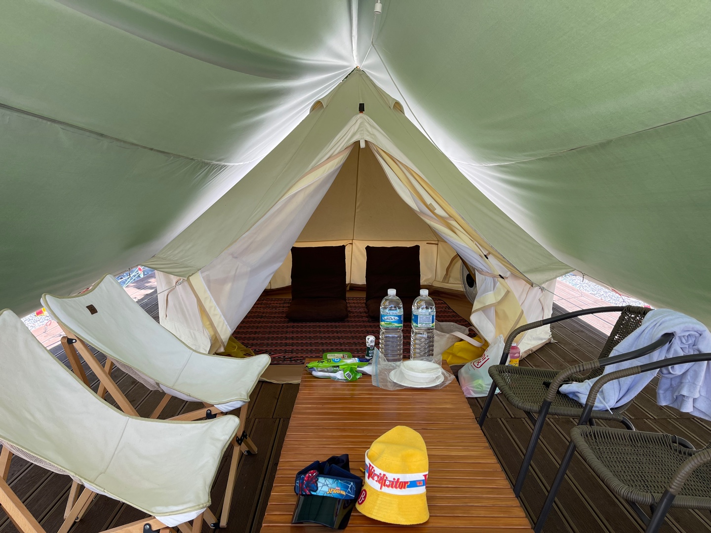 피크닉 텐트 안은 좌식의자 2개가 있다. (저 의자 눕히면 180도로 눕혀짐)